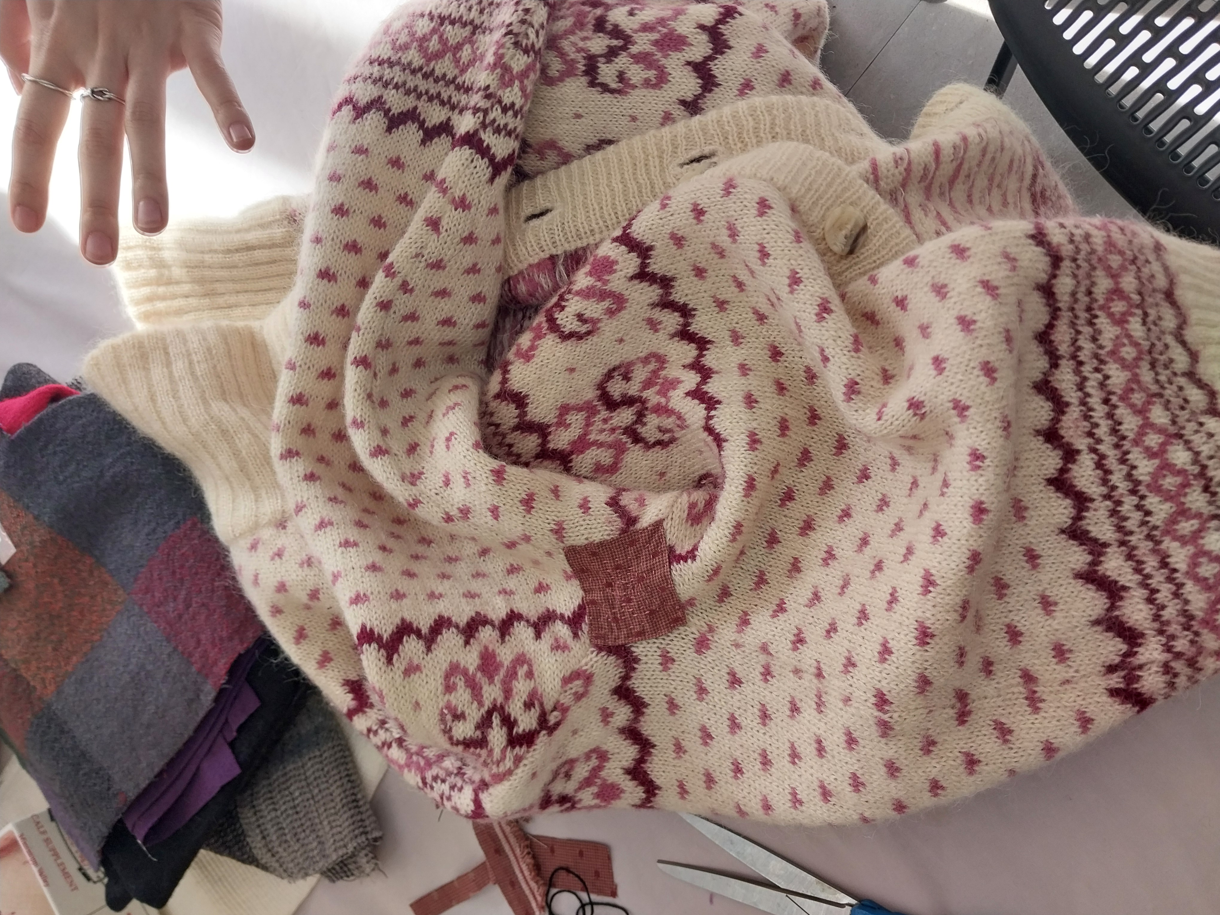 - 나 역시도 그런 취지에 공감하고 관심을 갖고 있었기에, 2025년 초 아직 쌀쌀한 날씨에도 진행된 21%랩에 참여했고 좋아하는 구제니트에 구멍난 부분을 보수할 수 있다는 이야기를 듣고 바느질 전문가분의 워크샵에 참여했다. 이미 많은 분들이 관심을 갖고 열심히 바느질을 하는 자리에 동참해서 선생님이 가져오신 다양한 소재의 천들을 만져보고 또 적절한 것들을 골라서 매치해보고 바느질방법과 니트의 특성에 맞는 수선방법까지 조곤조곤 설명해주시는 선생님의 이야기를 따라 한땀한땀 작업하다보니 작은 구멍을 메꿀 수 있었고, 다른 분들과 함께 각자의 작업을 비교해보며 이야기꽃을 피우는 즐거운 자리가 되었다.
